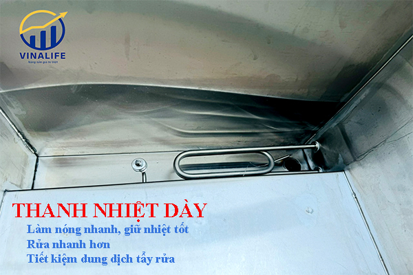 Phía dưới bồn rửa là thanh nhiệt chất liệu inox 304 siêu bền với công suất 3kW, cho khả năng gia nhiệt nhanh chóng và giữ nhiệt dài lâu.