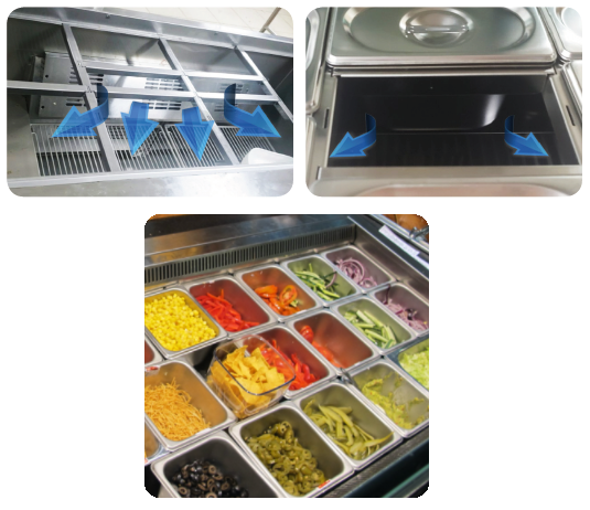 Bàn salad cánh kính 1.5m thường được sử dụng trong các nhà hàng bán đồ ăn buffet. Mặt trên của bàn là các khay inox 304 có nắp đậy, với nhiệt độ bảo quản trung bình từ 2 – 8 độ C.