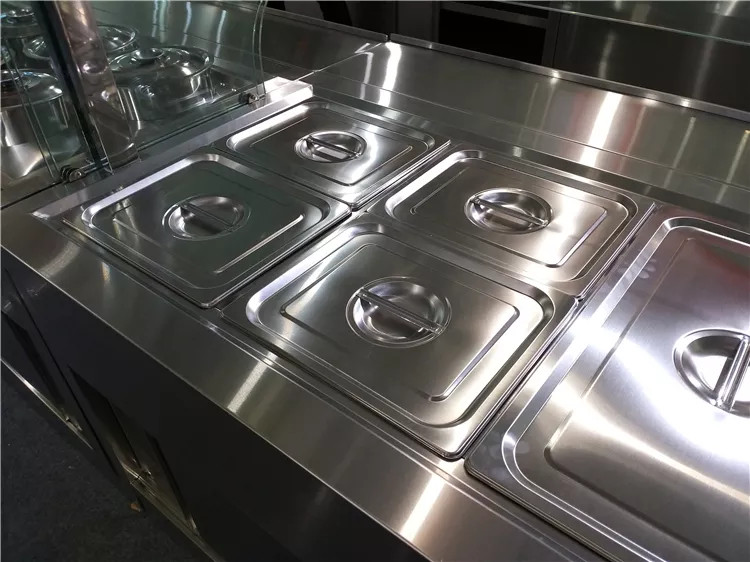 Nếu là tủ vừa giữ nóng vừa trưng bày thức ăn thì thiết kế sẽ có lớp kính trong suốt, nhằm giúp các thực khách của cửa hàng có thể chọn món một cách dễ dàng mà vẫn bảo đảm thức ăn đang nóng, tránh tình trạng bụi bặm.