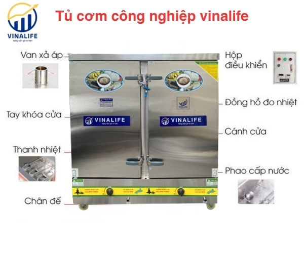 - Ngoài ra tủ nấu cơm dùng gas 24 khay Vinalife còn được tranh bị có van xả nước, phao cấp nước tự động, van xả đáy, van gas.