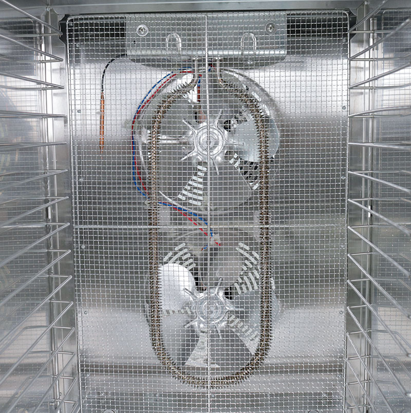 Bên trong thùng máy được gắn các khung bằng inox để đỡ khay sấy. Có tổng cộng 12 hàng khung được lắp đối xứng tương ứng với 12 tầng sấy.